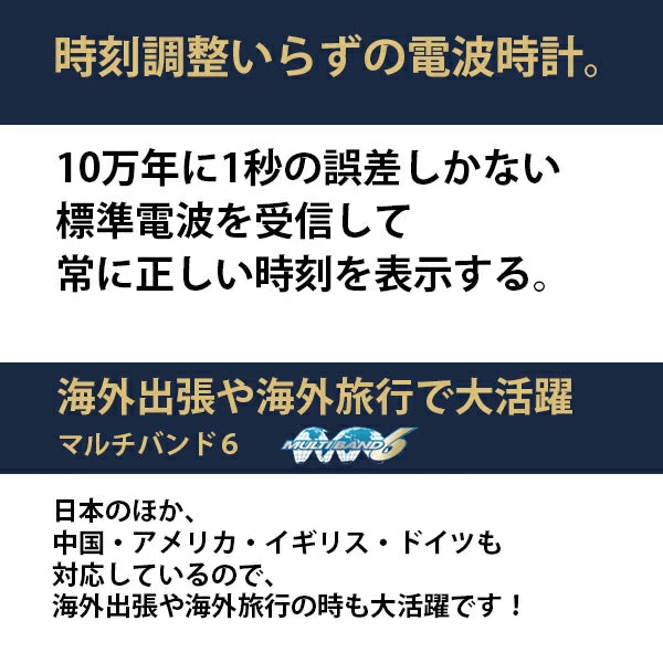 | 機 能 | 電波受信機能:日本・北米・ヨーロッパ・中国地域対応 MULTIBAND6 ソーラー充電システム(文字盤) |
